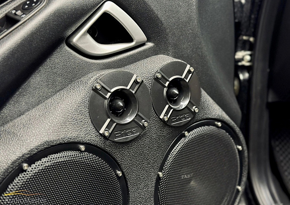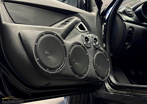 В данном автомобиле мы произвели установку фронтального звена. При помощи накладных подиумов в передние двери были установлены 3 пары динамиков Pride Ruby Air 8 v.2, которые подключены к 2-х канальному усилителю Dynamic State SPARTA 300.2.