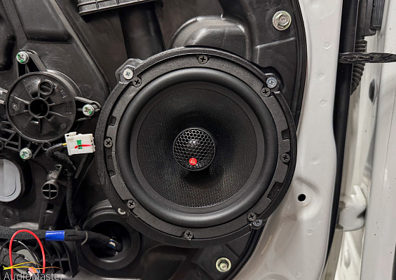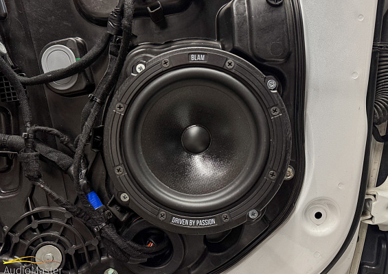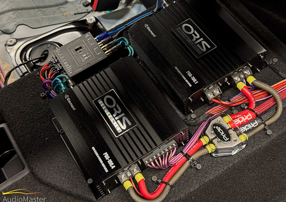 В передние двери автомобиля установили 2-х компонентную акустику Blam Express 165, на тыл установили коаксиальную акустику Aura Venom-CL6X. Динамики подключили от усилителя Oris PDA-100.4.