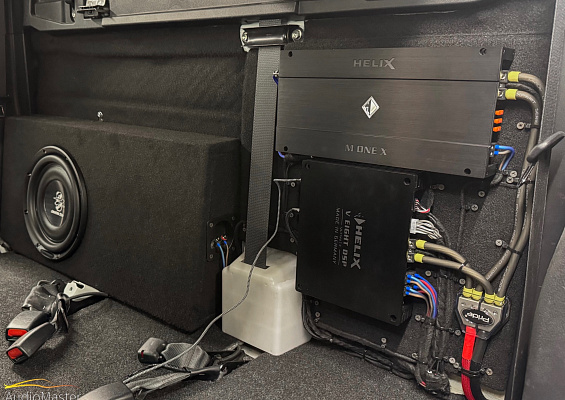 Сабвуферное звено состоит из моноблока HELIX M One X и 10-ти дюймового сабвуфера Ground Zero GZRW 250-D2 Flat, установленный в изготовленный нами короб.